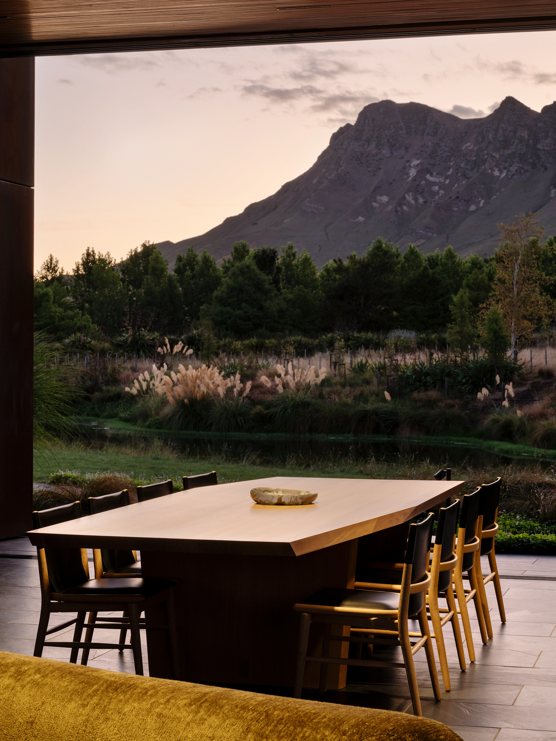 The result is a sculptural, rusting steel structure, designed for entertaining in New Zealand's Hawke's Bay region. Vitrocsa sliding doors frame spectacular views of the river, lake, orchards and dramatic Te Mata Peak.