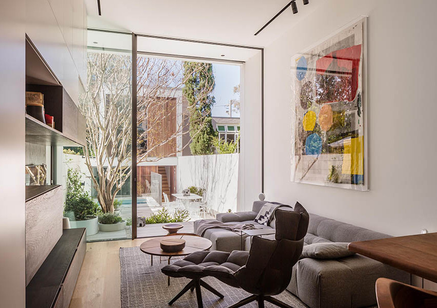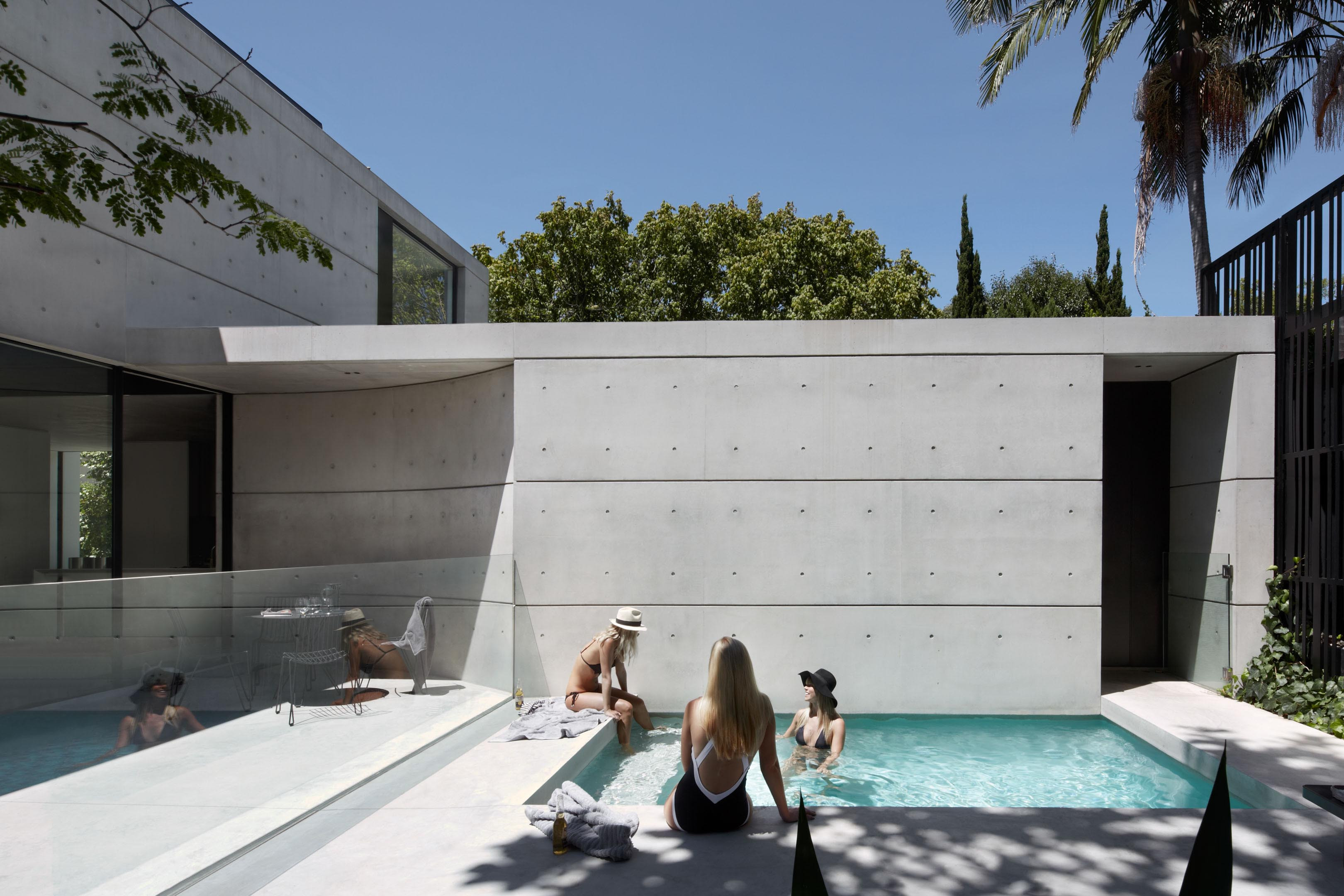 “Generous full-height Sliding glass doors create a seamless connection with the courtyard and plunge pool.”